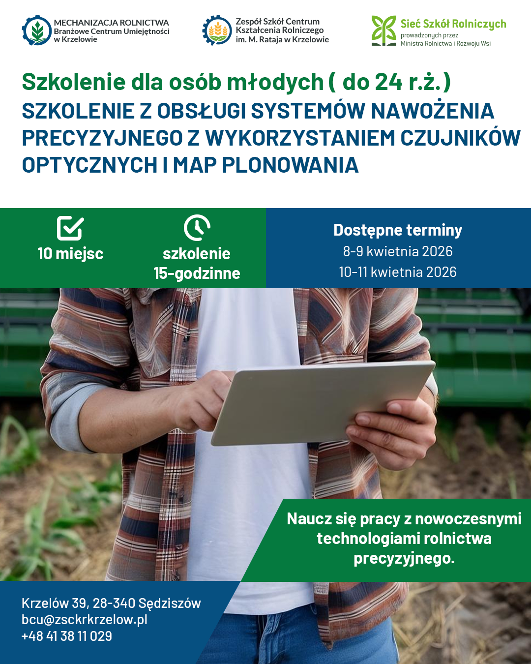 - SZKOLENIE Z OBSŁUGI SYSTEMÓW NAWOŻENIA PRECYZYJNEGO W WYKORZYSTANIEM CZUJNIKÓW OPTYCZNYCH I MAP PLONONOWANIA; 10 miejsc, szkolenie 15 godzinne, data: 8, 9 kwietnia 2026 r.