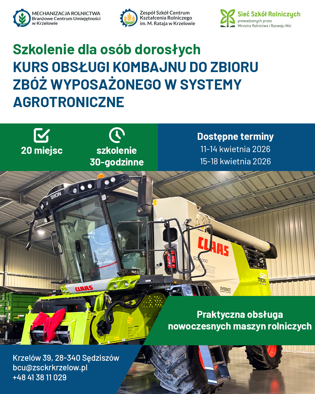 - KURS OBSŁUGI KOMBAJNU DO ZBIORU ZBÓŻ WYPOSAŻONEGO W SYSTEMY AGROTRONICZNE; 10 miejsc, szkolenie 30 godzinne, data: 11, 12, 13, 14 kwietnia 2026 r.